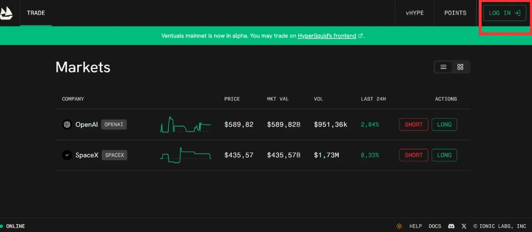 Ventuals s’interface désormais directement avec l’orderbook natif d’Hyperliquid, les traders ouvrent et gèrent leurs positions depuis Hyperliquid, tandis que le site Ventuals sert surtout de hub pour le suivi des marchés, des points et des incentives. Une fois les fonds déposés sur Hyperliquid, vous ouvrez directement les marchés Ventuals (par ex. SPACEX‑USDH, OPENAI‑USDH) depuis l’interface Hyperliquid.