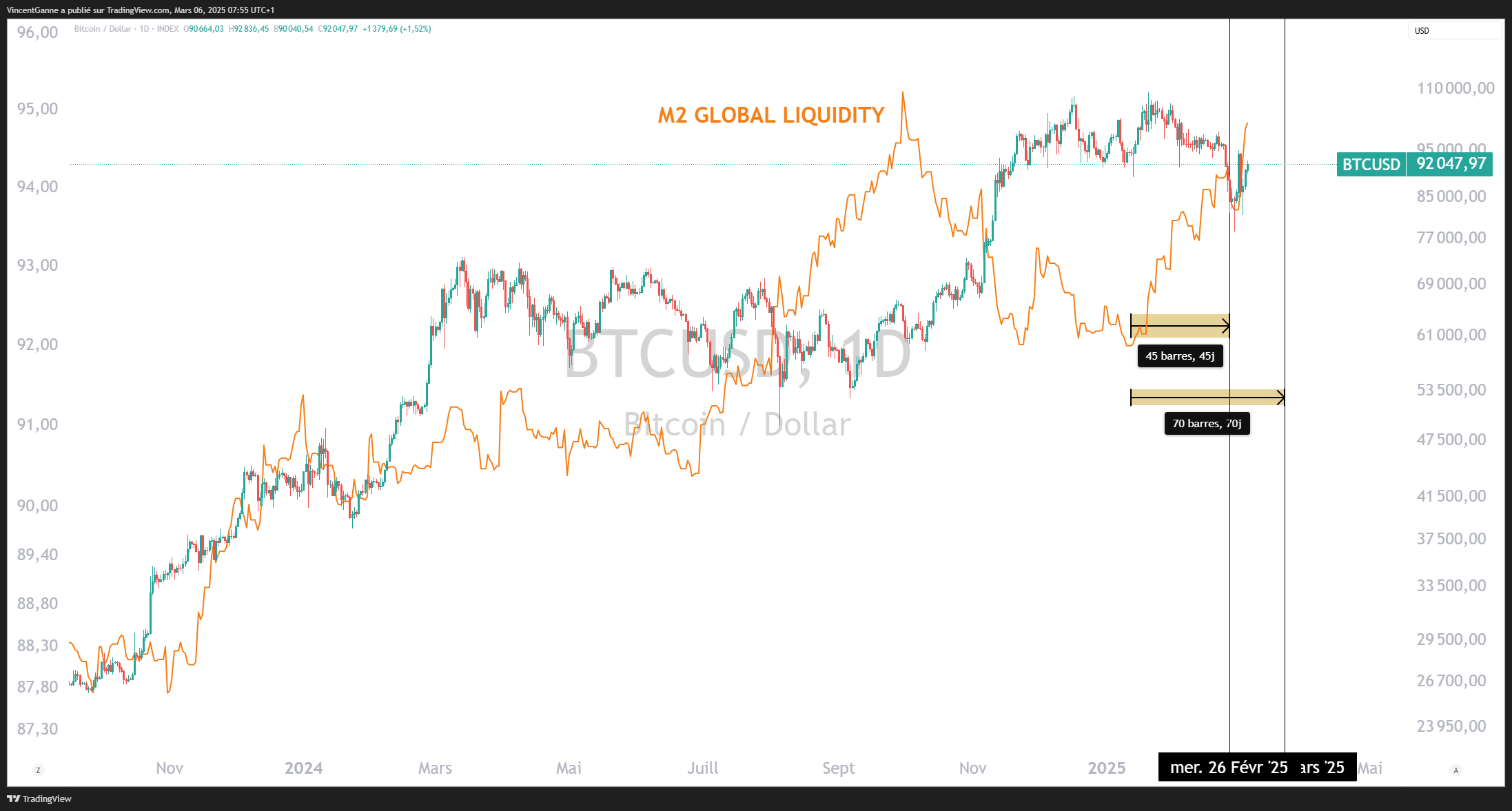 Il est assez impressionnant de constater que la liquidité mondiale anticipe de 50 à 70 jours les mouvements de bitcoin en bourse.