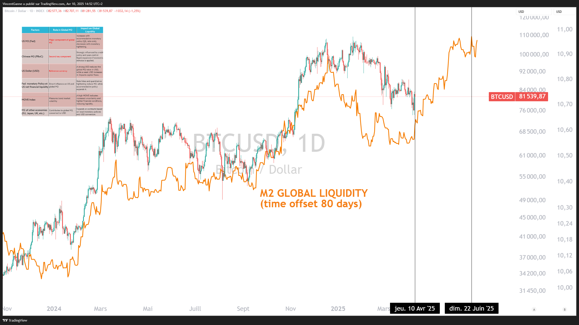 Graphique qui expose les bougies japonaises en données quotidiennes du cours du Bitcoin avec la courbe de la liquidité mondiale selon la somme des agrégats M2 des principales économies du monde