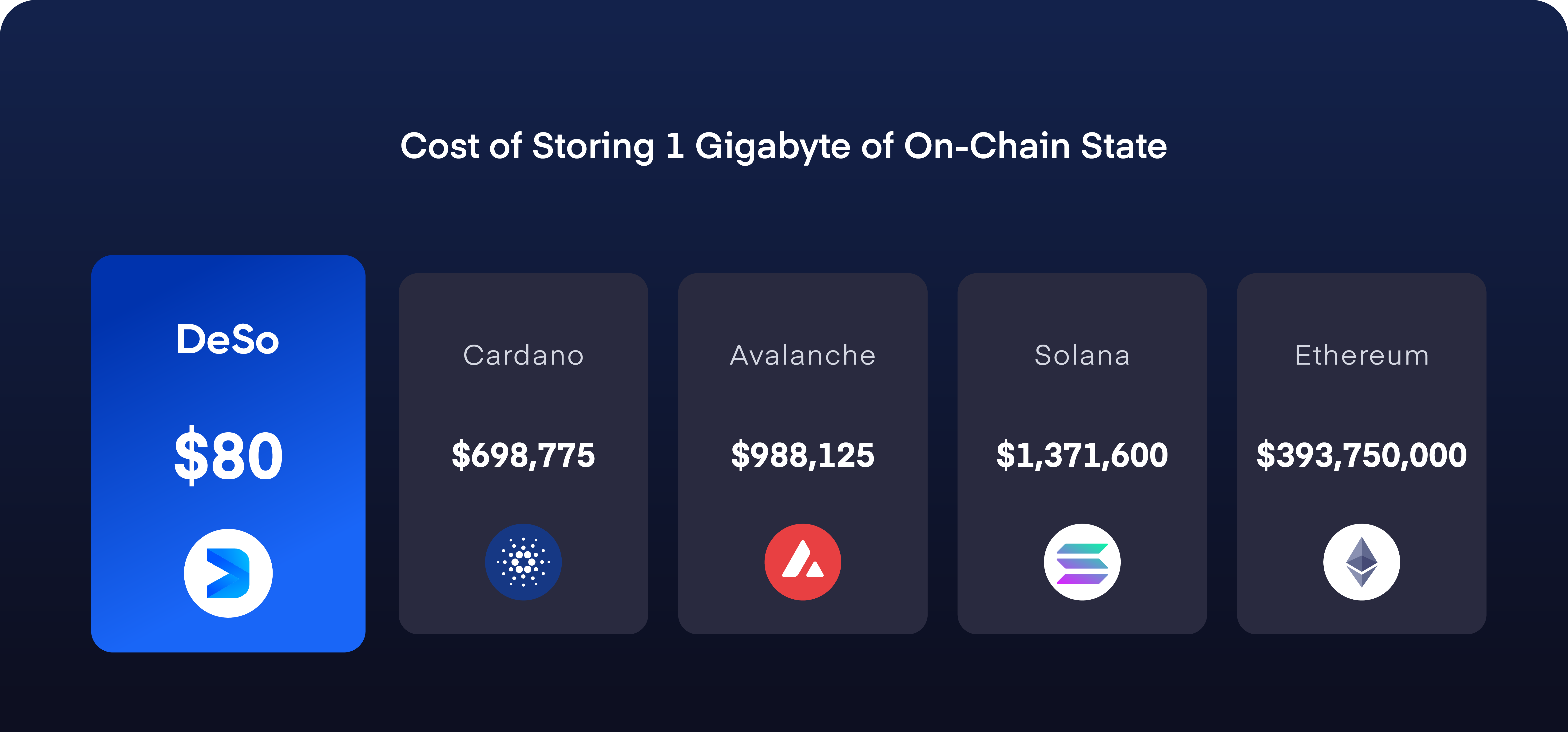 En effet, Ethereum dispose d’un état fini qui s’avère parfait pour les applications avec des besoins légers de stockage comme la finance décentralisée (DeFi). À l’inverse, les réseaux sociaux génèrent de nouvelles données à chaque publication et interaction qui doivent être stockées et indexées à faibles coûts pour rester compétitifs. En conséquence, ces applications nécessitent d’être hébergées sur une blockchain avec un état infini. Pour information, le coût de stockage de 200 caractères est équivalent à 0,000017 dollar sur DeSo contre 0,45 dollar sur Polygon.