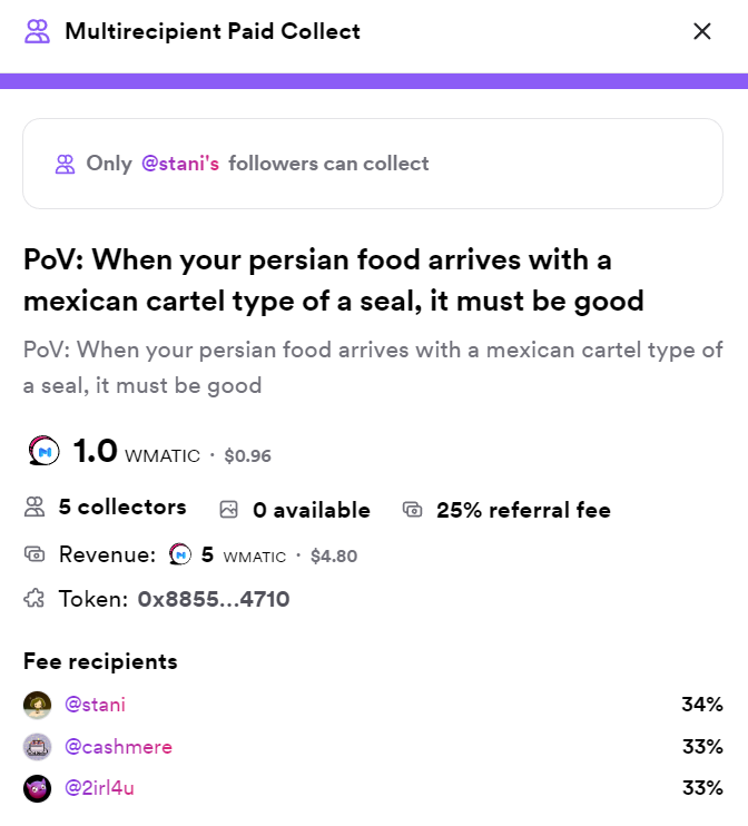 Exemple de publication monétisée. Seuls les abonnés de Stani peuvent la collecter et les revenus sont reversés à 3 destinataires (fee recipients).