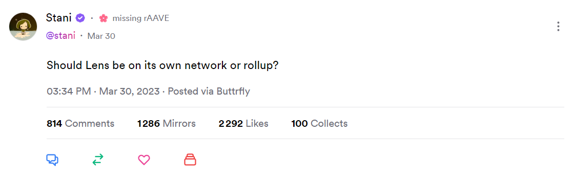 Pour ce qui est des perspectives à long terme, il serait pertinent de considérer le développement d’un potentiel roll-up ou bien d’une blockchain de layer 1 dédiée à ce type d’applications, en raison de leurs besoins de stockage et d'indexation conséquents. Ce n'est pas seulement moi qui le dit, mais aussi Stani Kulechov, fondateur d'Aave et de Lens Protocol qui soumet cette idée à sa communauté, le 30 mars dernier.