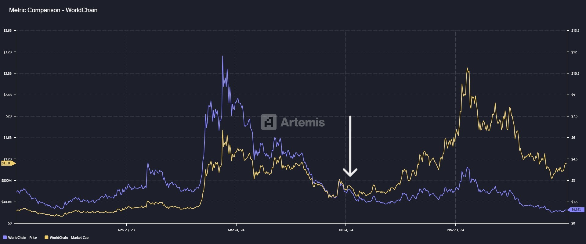 Ainsi, nous pouvons observer une relative décorrélation entre le market cap du projet et le prix du WLD depuis la mi-juillet 2024 (flèche blanche) :